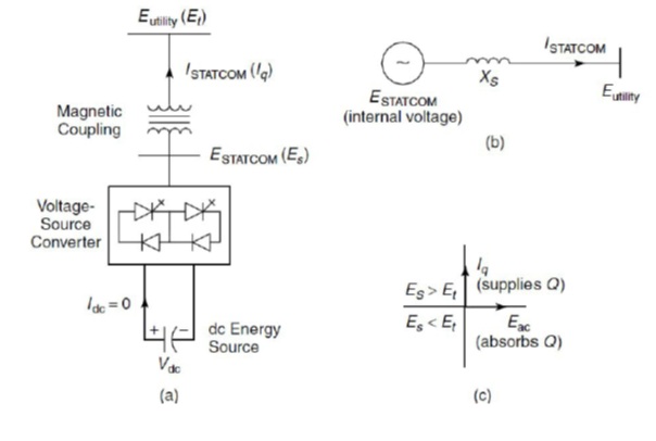 اين عنصر بطور موازي با شبکه و توسط يک ترانس قرار مي گيرد. شکل زیر شماتيک يک STATCOM و مشخصة آن و دياگرام برداري و مدار معادل آن را نشان مي دهد و ديده مي شود كه اين وسيله مي تواند در رنج وسيعي به صورت سلفي و خازني عمل كنترل ولتاژ را انجام دهد. در حالت كلي اين وسيله در قسمت DC شامل يک خازن است كه در اين صورت فقط قادر به تبادل توان راكتيو با شبکه خواهد بود .